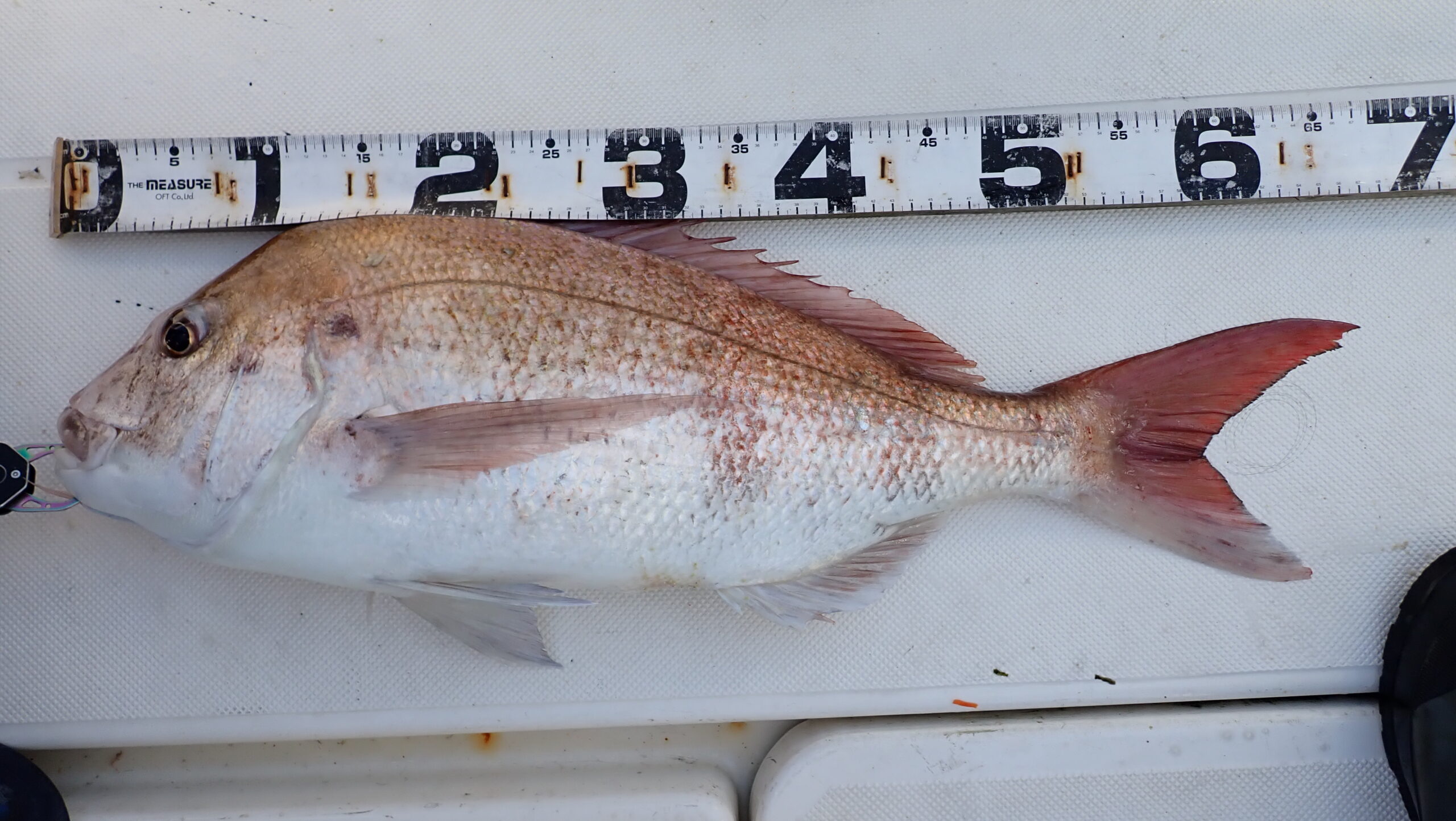 今年初真鯛ですか!下に下にトルクフルに引きます。お見事67真鯛です!