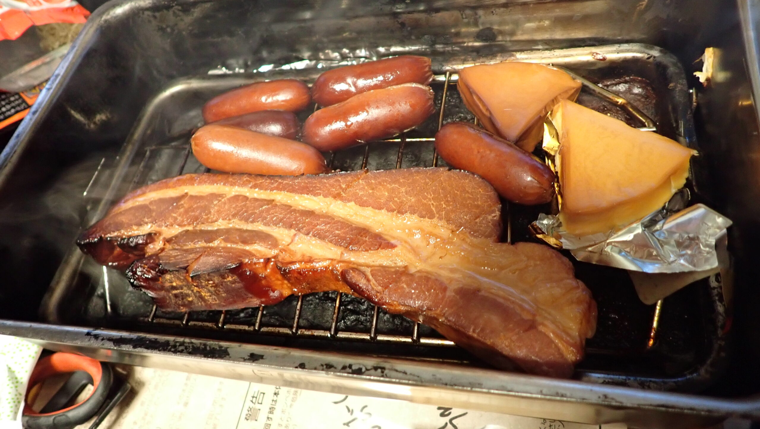 昼になり、冷凍庫にベーコンあったんで、燻製して食いました
