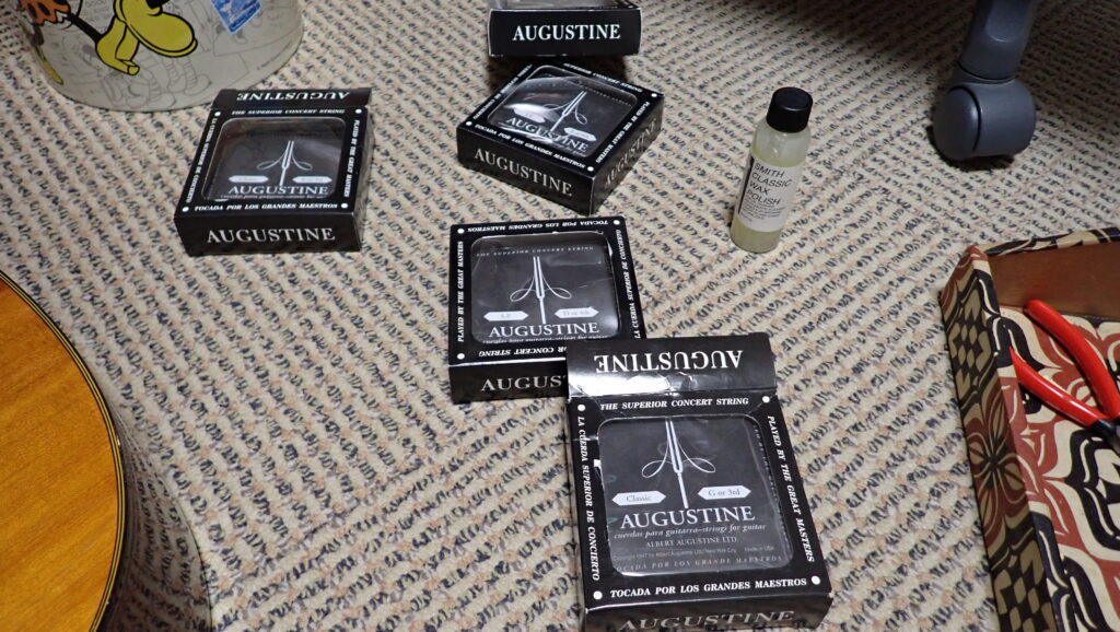 ぴかぴかにポリッシャしてペグも磨き弦を張っていきます。アコギとは全然交換の仕方もちがいますからね。自分でも忘れてました。