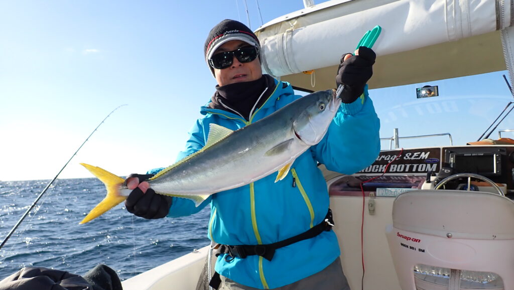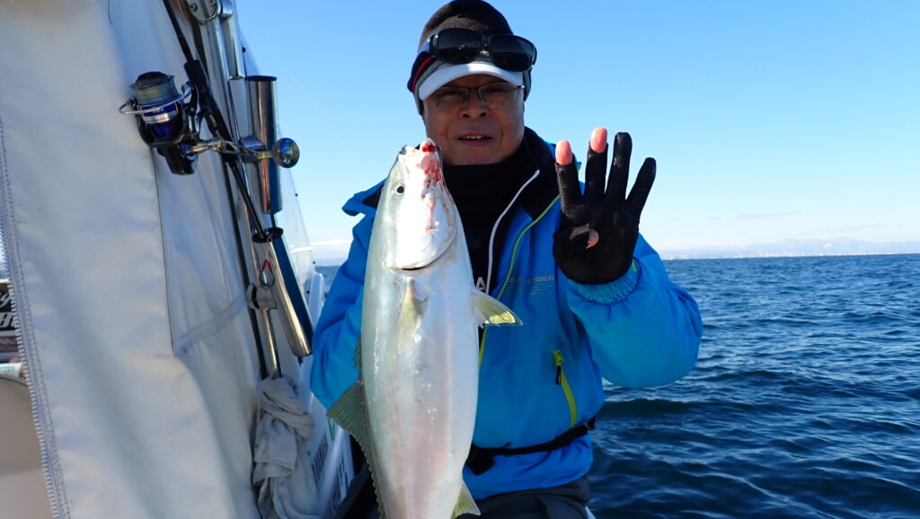 後半は凪になり渋くなったかとポイント変更したら、また当たりました。65cmがWでフッキングするとかなり重くブリと思いがっかりしました・・・・・・・・・。