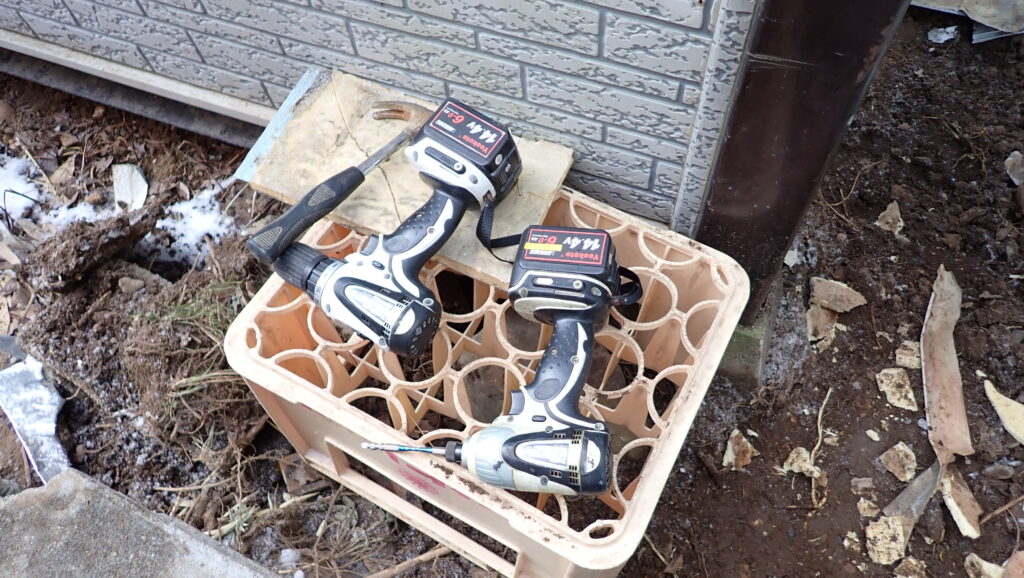 ジャッキで固定して、基礎にコンクリートで高さ調整します。まぁ、プロレベルの仕事量です。