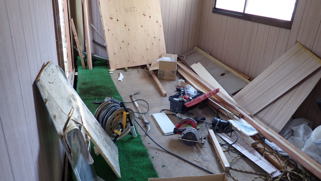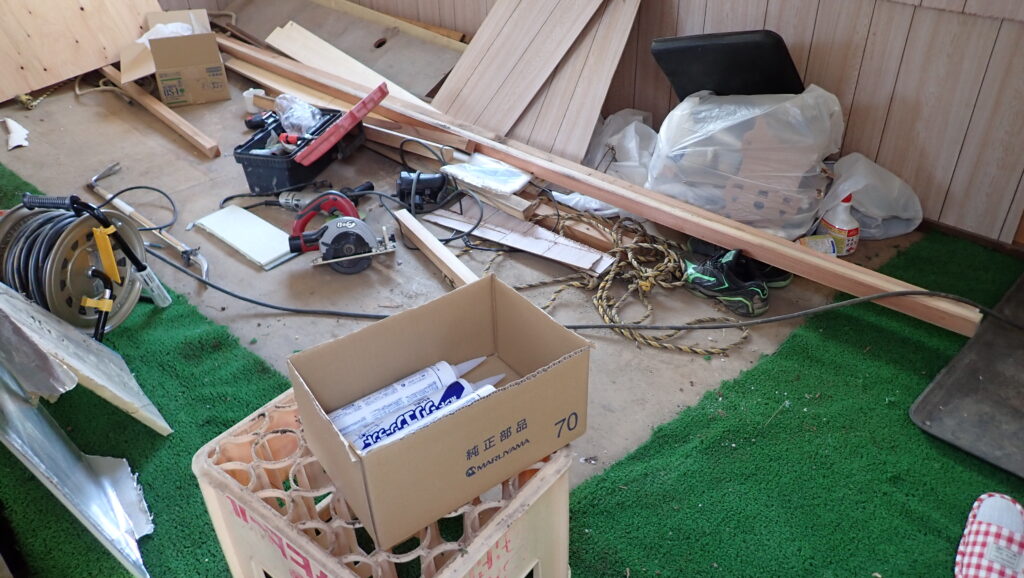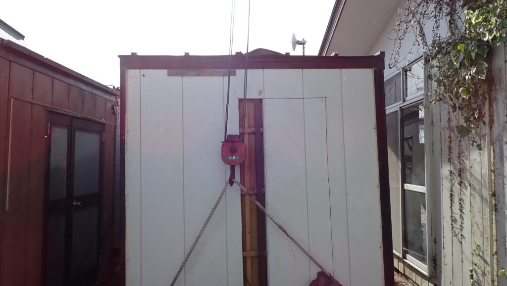 ユニットハウス3個の連結するため、ドアの位置合わせ、基礎の高さ、外壁の切断、結合で、いつものDIYレベルではない状態。captainも本気モードで挑んでます。