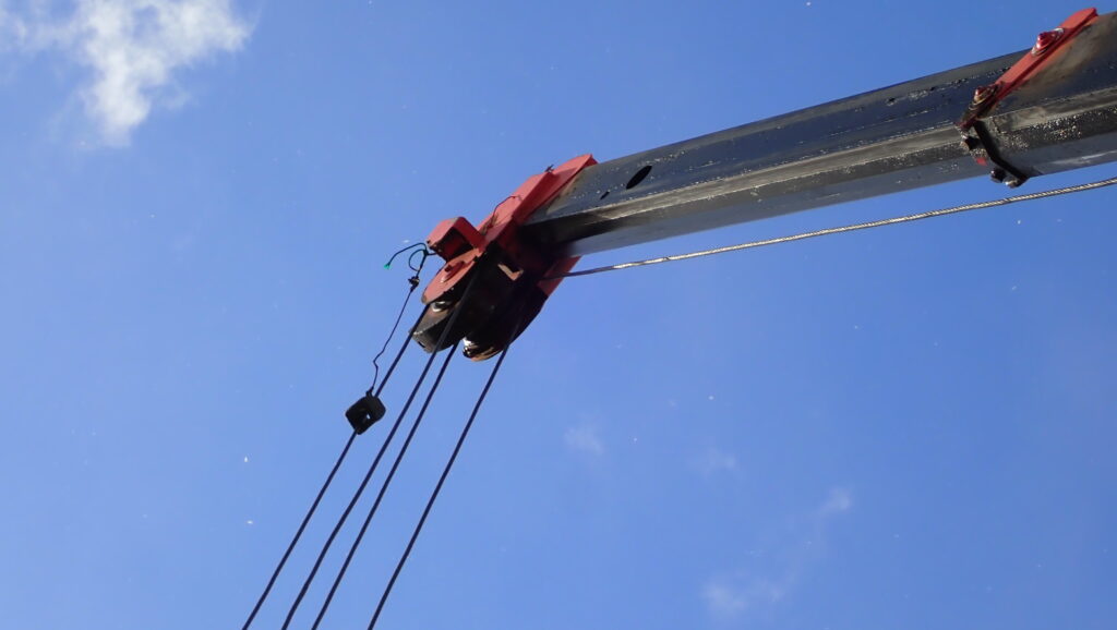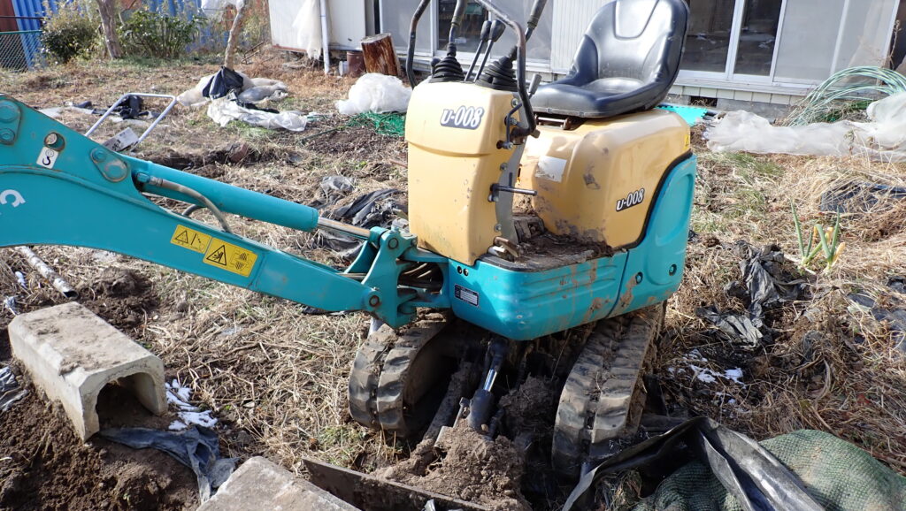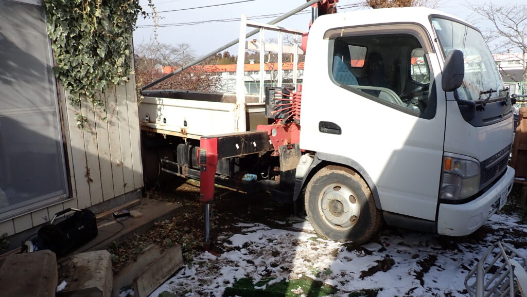 しかし、全部はアームが届かなく2点吊り上げて、ユンボで押したり引いたりです。
