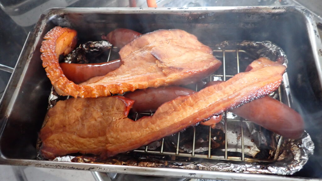 居住の動線確保して仮内装LV1が終了したんで、昼は燻製しました。お湯も出るし、プロパンコンロなんで片付けも楽です。しかし、寒すぎてジャッキアップして基礎にコンクリート敷くのは当然やめました。